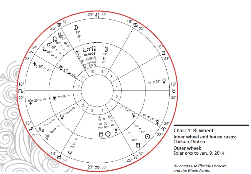 Sure enough, when I examined young Ms. Clinton’s horoscope (see Chart 1, page 34), I saw that solar arc (SA) Uranus was at 29°16’ Sagittarius in January 2014. Uranus would solar arc to the Aries Point (0° cardinal) later in the year, in October. What I found interesting is that, in her natal chart, Uranus rules the 4th house, and when a planet that rules an angle in the natal chart moves by solar arc to the AP, there seems to be an extra power to this kind of “bloom.” So, I asked myself, “What would be happening in her life with 4th-house matters, i.e., family issues?”