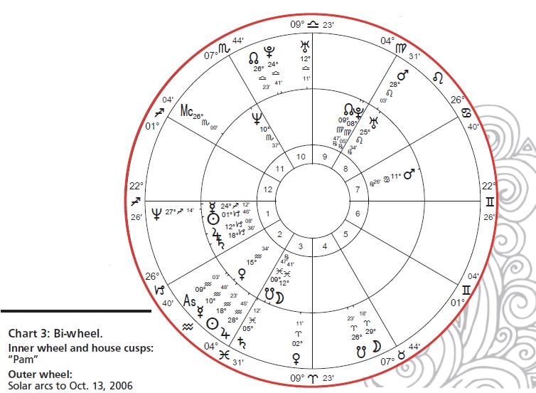 It’s fascinating that, in a consultation Pam and I had in 2005, I mentioned to her that there was a suggestion of marriage or perhaps significant relationship development in her chart in 2006. I saw this with SA Venus = Sun, which was exact in mid 2006. Because I never even considered that pregnancy might occur (given the fact that she was in her mid 40s), I naturally thought of marriage or relationship issues instead. The marriage did manifest, but it was triggered by the fact that she became pregnant!