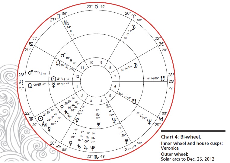 Veronica has one of the very easyto- spot signatures for heightened fertility. (See Chart 4, below) When she asked the question about possible pregnancy, she had SA Ascendant at 27°55’ Virgo. I noticed that she would have SA Asc. = Venus exact in the fall of 2012 (solar arc planets advance forward 5 minutes of arc per month). She also had transiting Pluto square her natal Jupiter–Saturn conjunction (Jupiter is the ruler of the 5th house). I knew that, in the summer of 2012, transiting Uranus would join the mix in opposition to natal Jupiter.